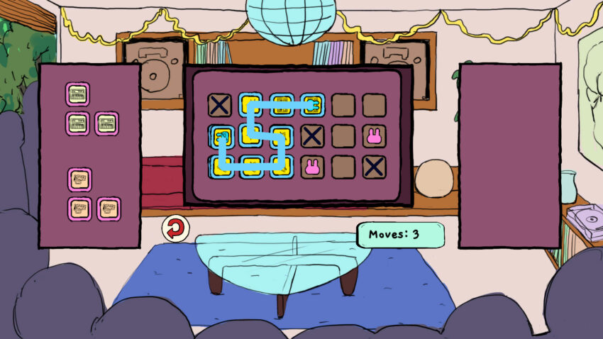 As you progress in the story and continue solving puzzles, they do get more challenging. Soon there is even a turn limit before you lose, which can make the game feel like a more complex puzzle game than you might expect from the cute, hand-drawn visuals that appear in it. I played a bunch of DJ Bunny at Good Game Dev Fest, where I quite liked the puzzle elements of the game. The story of trying to discover yourself and make a path outside of your home town is lovely as well.